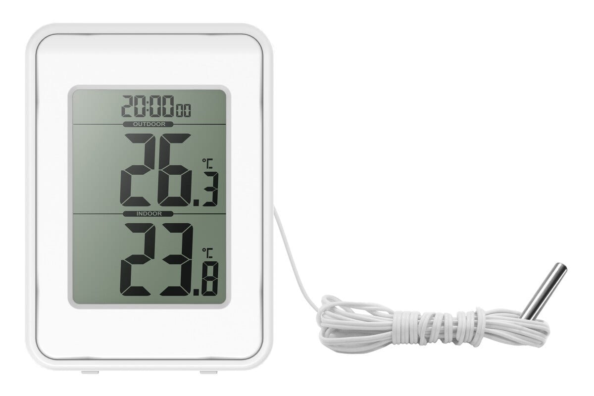 Hold kontroll på temperaturen både inne og ute med et smart digitalt termometer som gir deg all informasjon du trenger med ett blikk. Den tydelige displayen viser både innetemperatur, utetemperatur og klokke, perfekt for deg som vil ha full oversikt hjemme. Den lange sensorkabelen på 2,5 meter gjør det enkelt å plassere giveren utenfor vinduet og få nøyaktige målinger med en gang.