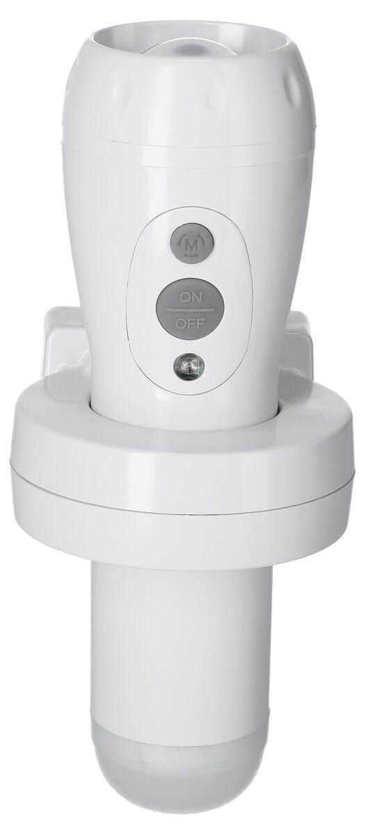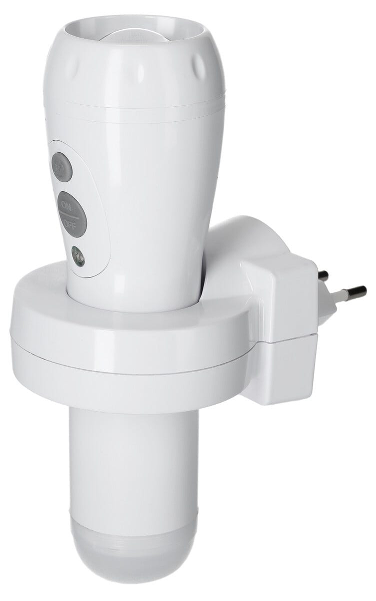 Slipp å famle i mørket - med denne oppladbare lommelykten med nattlys har du alltid lys klart når du trenger det. Den lades automatisk i holderen og slår seg på ved strømbrudd, noe som gjør den til en trygg løsning i hjemmet. Perfekt på barnerommet, i gangen eller i trappen der du vil ha et mykt lys som viser vei i mørket.