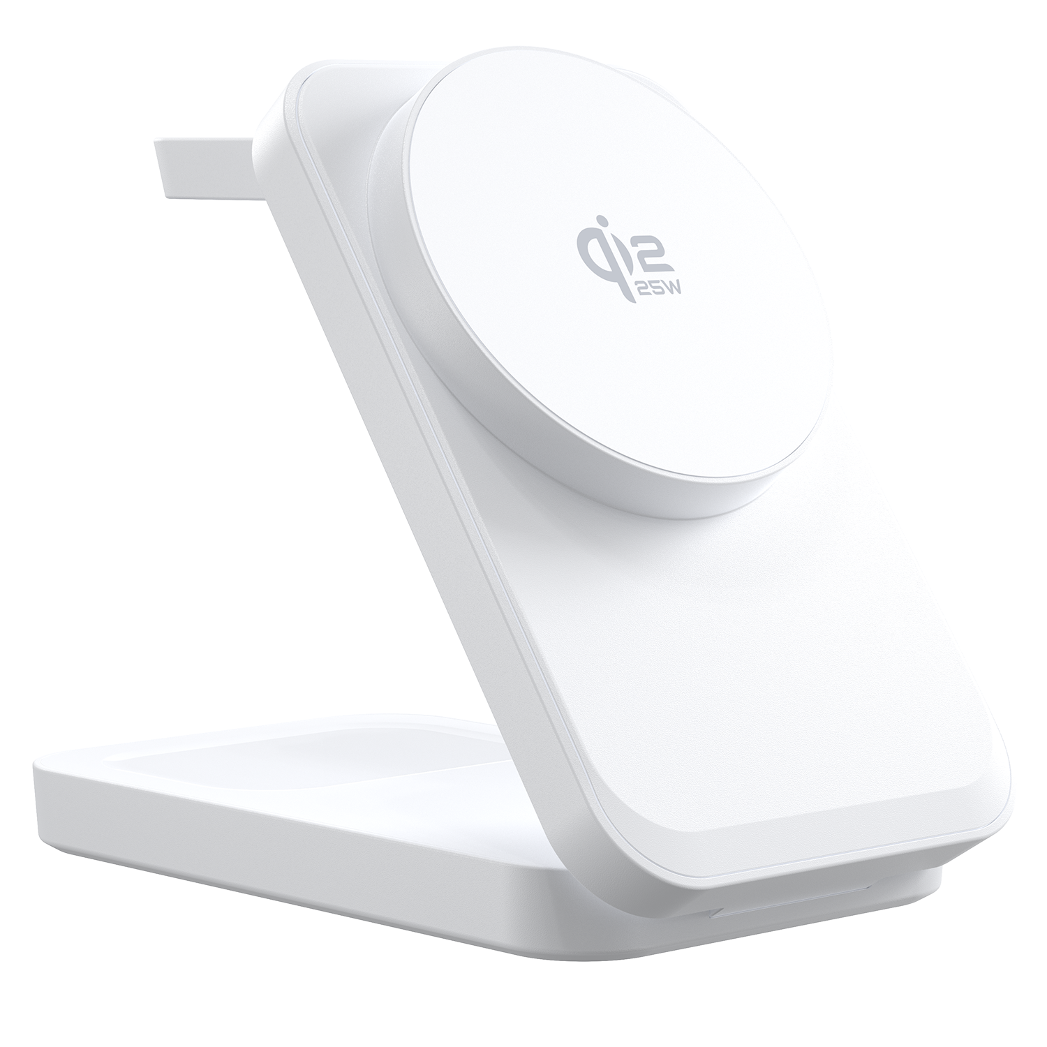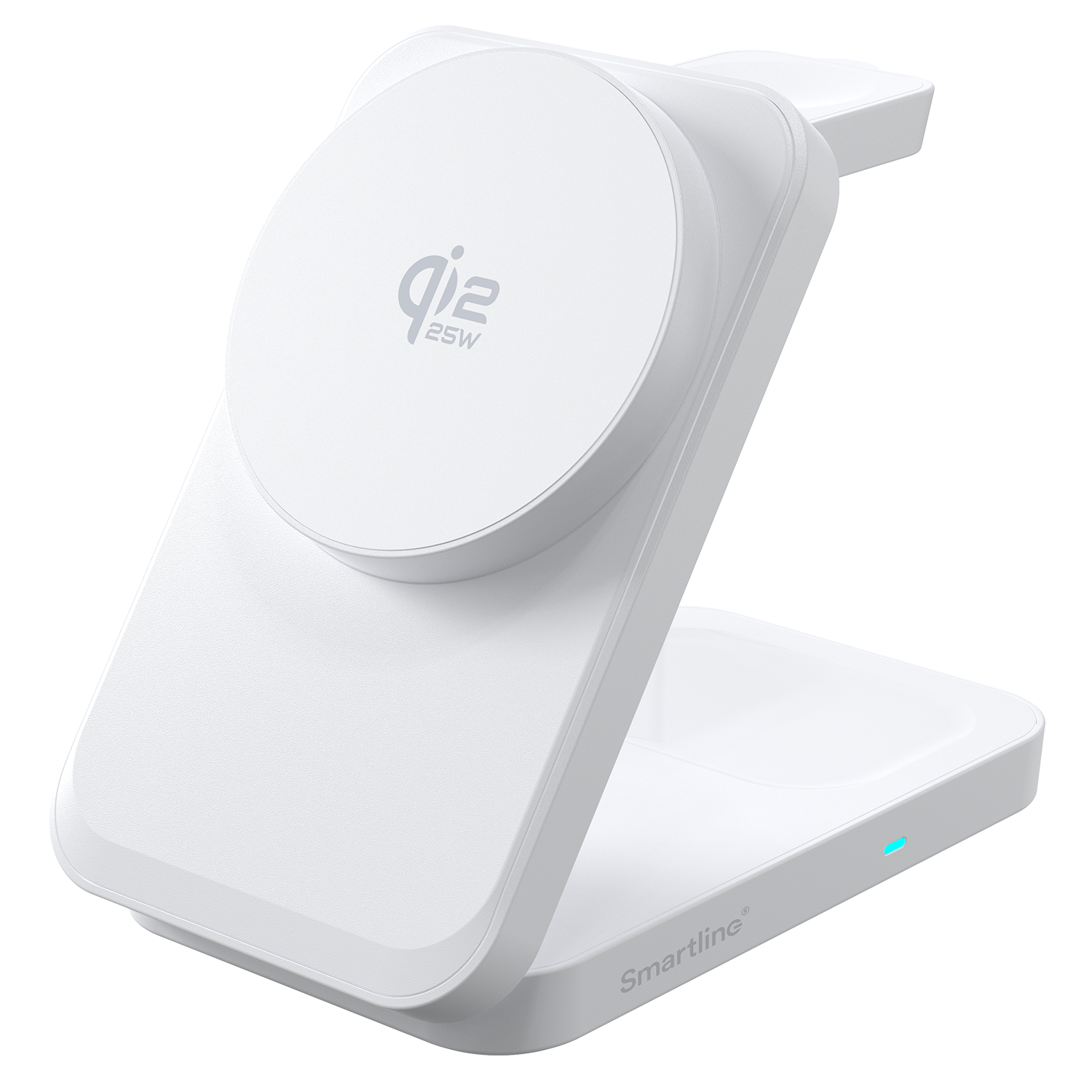 Ladestasjonen har MagSafe-støtte og fungerer med smarttelefoner, AirPods og Apple Watch som støtter MagSafe-lading. Her får du rask, sikker og stabil lading med opptil 25 W for telefonen, 2.5 W for smartklokken og 5 W for hodetelefonene. USB-C til USB-C-kabel følger med, mens strømadapter kjøpes separat (anbefalt 45 W).