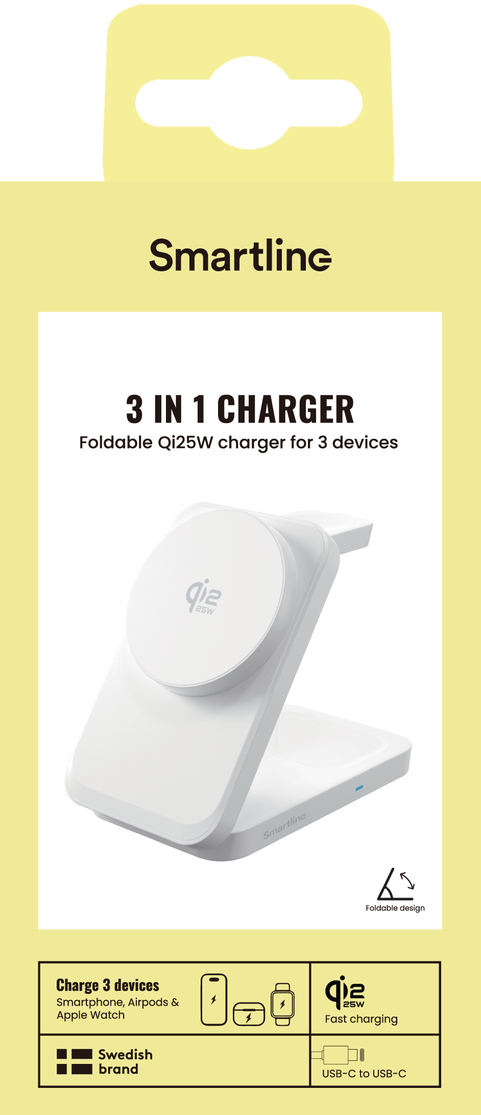 Lad opptil tre enheter samtidig med denne smarte og sammenleggbare Qi2.2 25W MagSafe-laderen. Samle telefon, klokke og hodetelefoner på ett og samme sted – helt uten kabelrot. Den kompakte og sammenleggbare designen gjør den like praktisk på skrivebordet som i vesken når du er på farten.