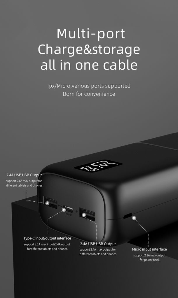 Powerbanken er utstyrt med én USB-C-port og to USB-A-porter, slik at du kan lade opptil tre enheter samtidig. USB-A-portene støtter opptil 2.4A for rask og stabil lading, slik at enhetene dine raskt er klare til bruk igjen. Du kan enkelt lade powerbanken via USB-C eller Micro-USB, noe som gir fleksibel og praktisk bruk uansett hvilken kabel du har.