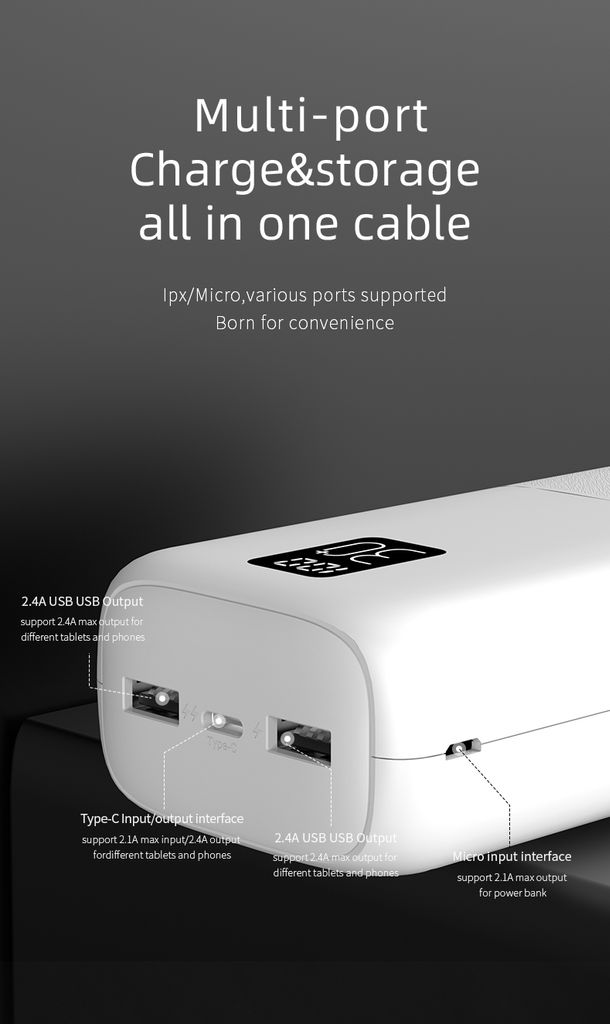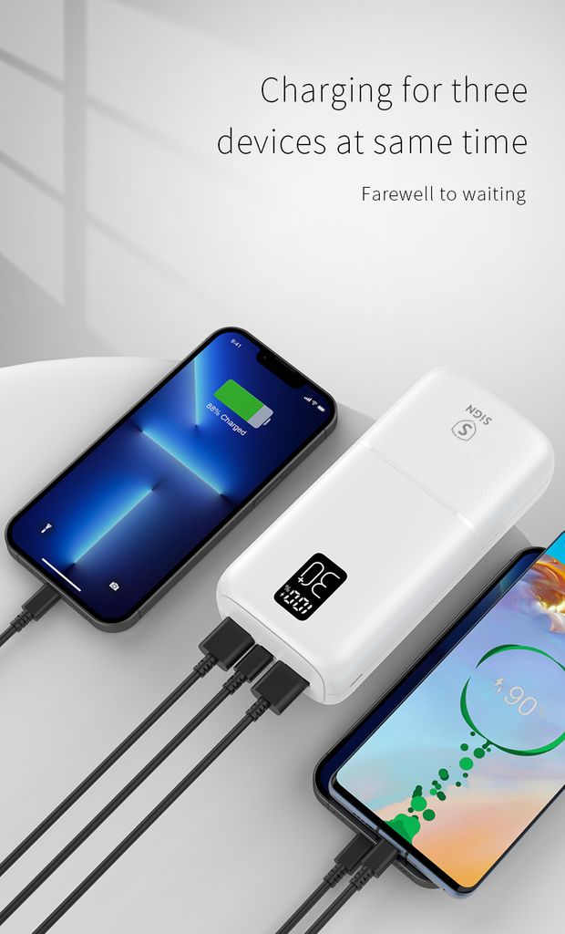 Powerbanken er utstyrt med én USB-C-port og to USB-A-porter, slik at du kan lade opptil tre enheter samtidig. USB-A-portene støtter opptil 2.4A for rask og stabil lading, slik at enhetene dine raskt er klare til bruk igjen. Du kan enkelt lade powerbanken via USB-C eller Micro-USB, noe som gir fleksibel og praktisk bruk uansett hvilken kabel du har.