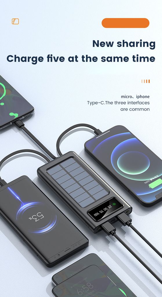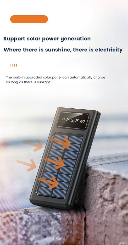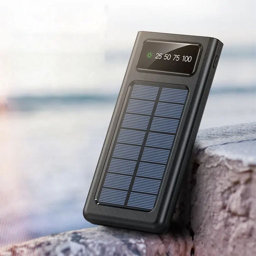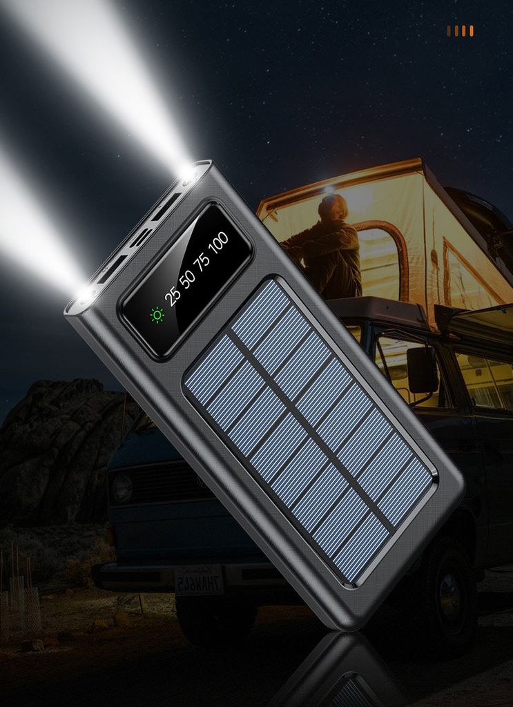 Lad powerbanken via USB-C, Micro-USB eller la solen gjøre jobben via de innebygde solcellepanelene. De integrerte kablene - USB-C, Lightning, Micro-USB og USB-A - gjør at du alltid er klar til å lade uten ekstra kabler. LED-displayet viser batterinivået, og den innebygde LED-lommelykten hjelper deg i mørket.