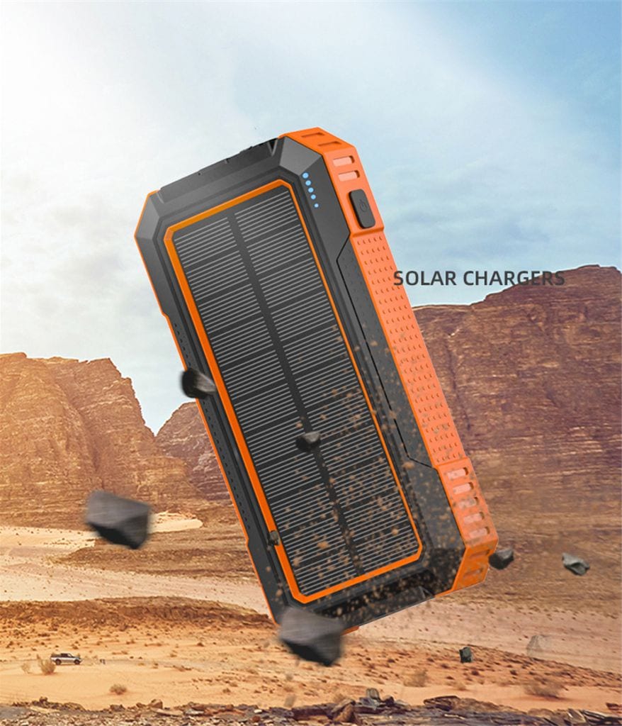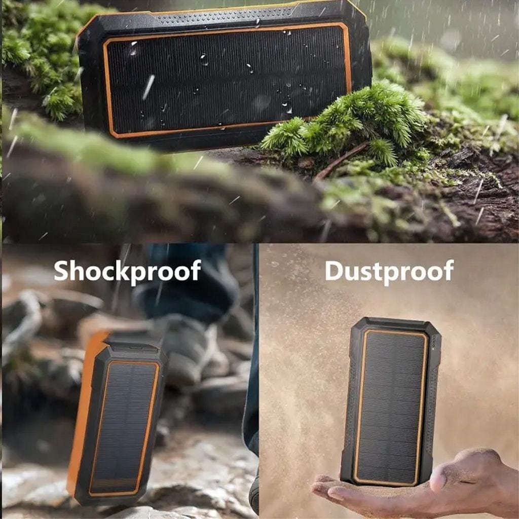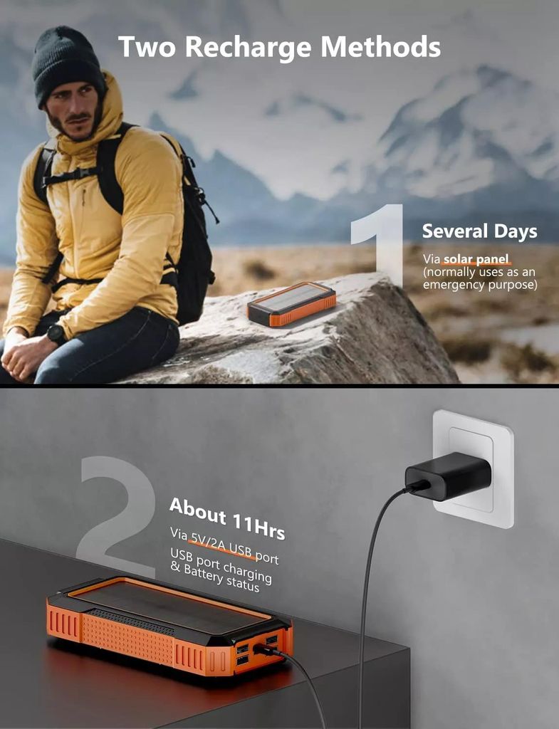 Fest mobilen på den trådløse ladeflaten eller bruk USB-portene for rask og fleksibel lading. Den innebygde lommelykten lyser opp i mørket og kompasset hjelper deg å finne riktig retning - perfekt for tur, camping og alle dine outdoor-eventyr.