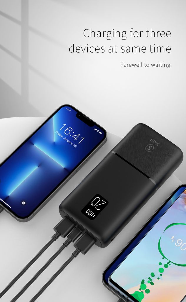 SiGNs ekstremt kraftige QC Powerbank 20 000 mAh er redningen når batteriet begynner å blinke rødt. Med stor kapasitet får du flere fulle ladinger til mobil, nettbrett og andre USB-enheter – perfekt for reiser og lange dager.