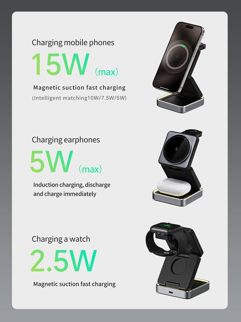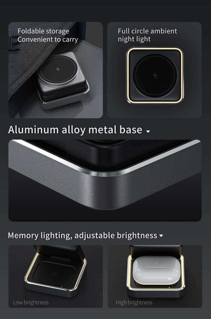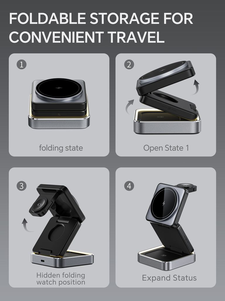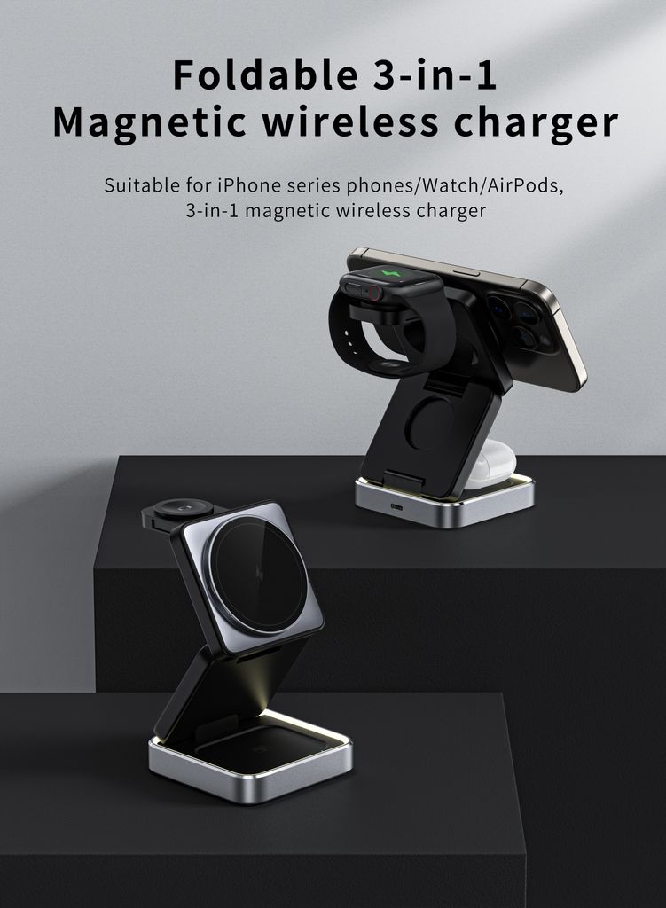 Sammenleggbar 3-i-1 Trådløs Magnetisk Ladestasjon 15W, Svart