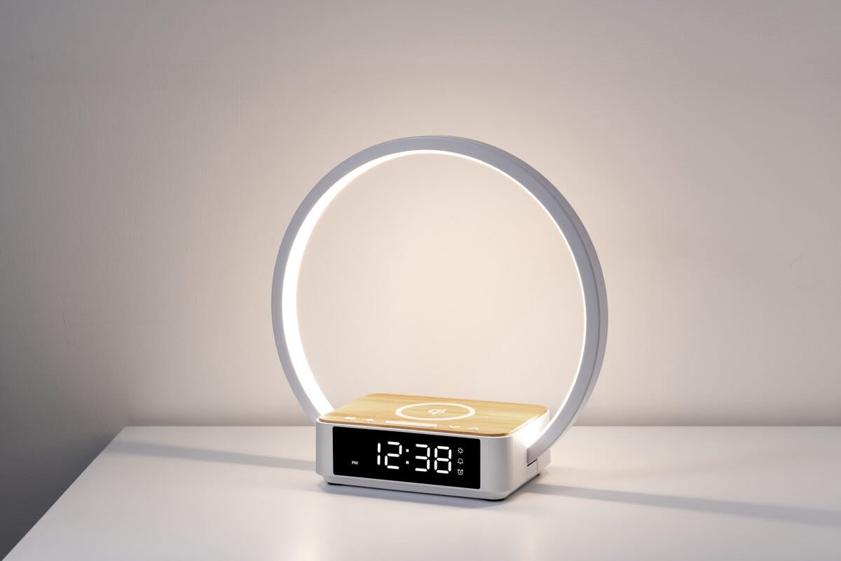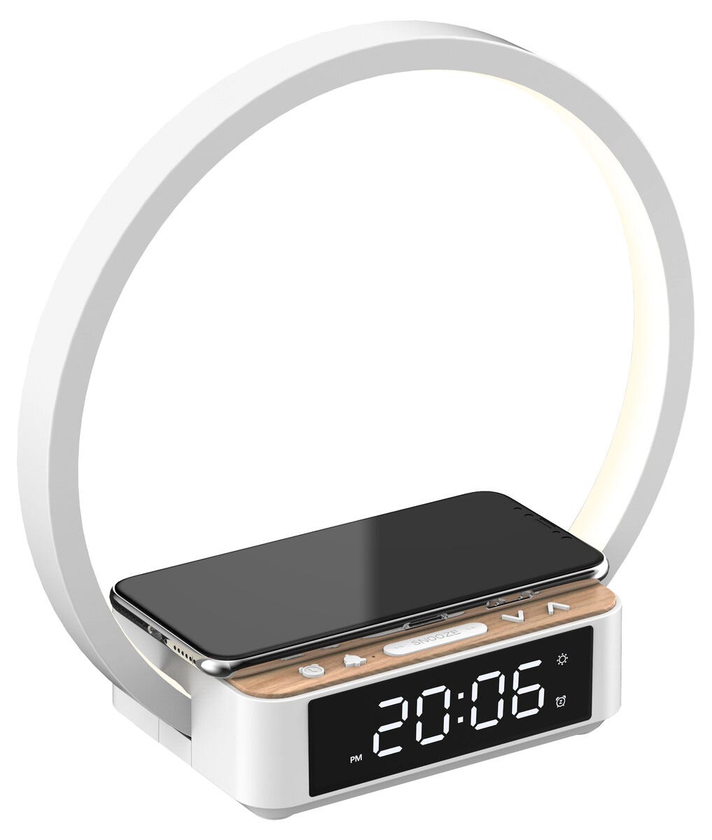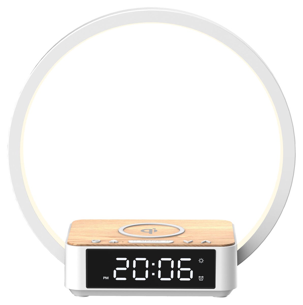 Våkne roligere og få en mer behagelig start på dagen med en digital vekkerklokke med Wake-Up Light og trådløs Qi-lading. LED-lysringen øker gradvis i styrke før alarmen går og hjelper kroppen å våkne mer naturlig, samtidig som mobilen eller hodetelefonene dine lades trådløst direkte på toppen. Den tydelige og dimbare LCD-skjermen gjør det enkelt å se tiden både dag og natt, og flere lysmoduser lar deg tilpasse belysningen etter behov og stemning. Backupbatteriet sørger for at tiden lagres selv ved strømbrudd, slik at du alltid våkner til riktig tid.