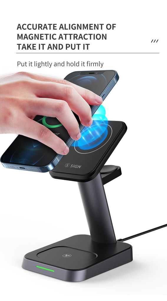 Lad alt på ett sted med SiGN 3-i-1 trådløs MagSafe ladestasjon 15W. Den magnetiske designen lar deg feste mobilen direkte for stabil og trådløs lading uten kabelrot. Perfekt for skrivebordet, nattbordet eller gamingoppsettet.