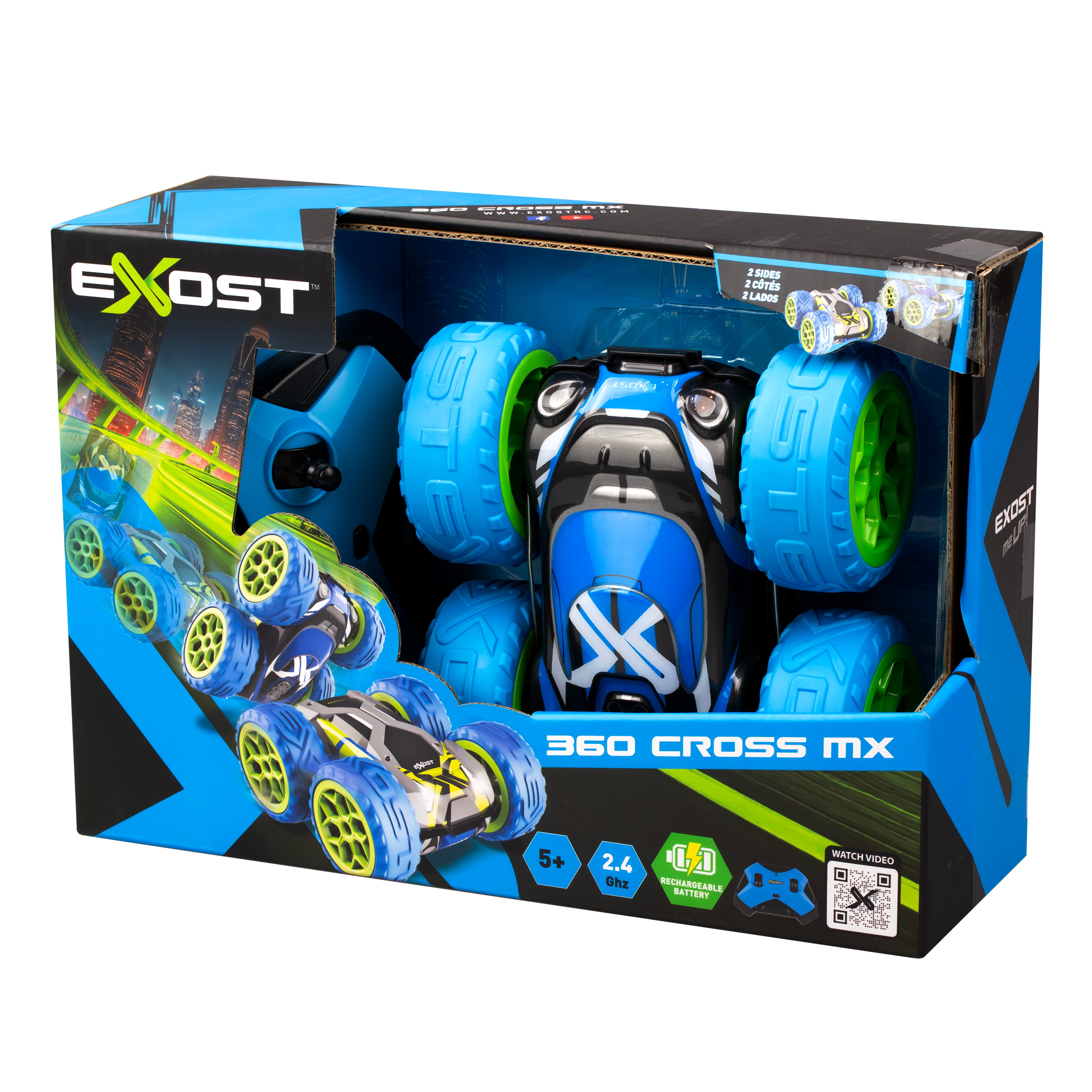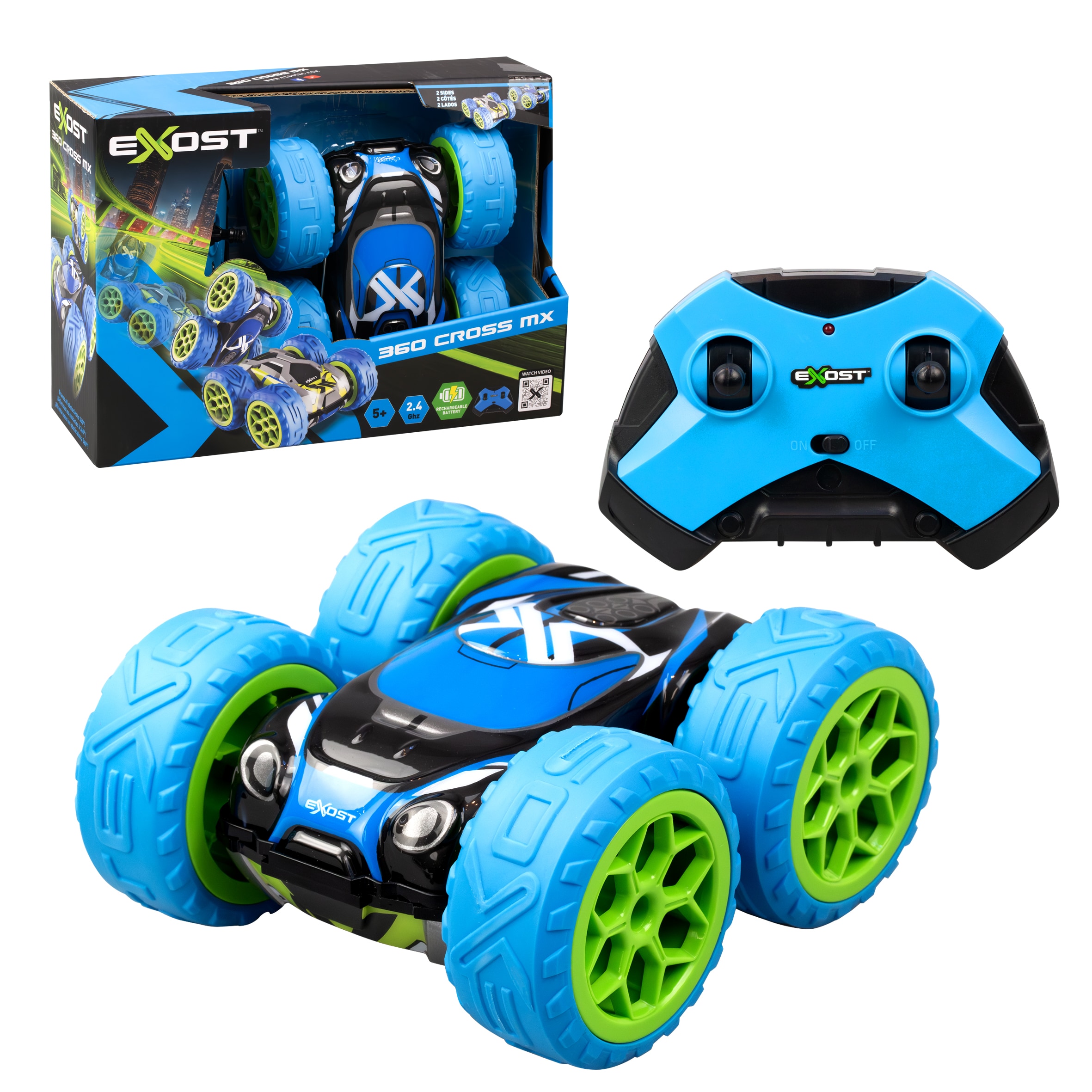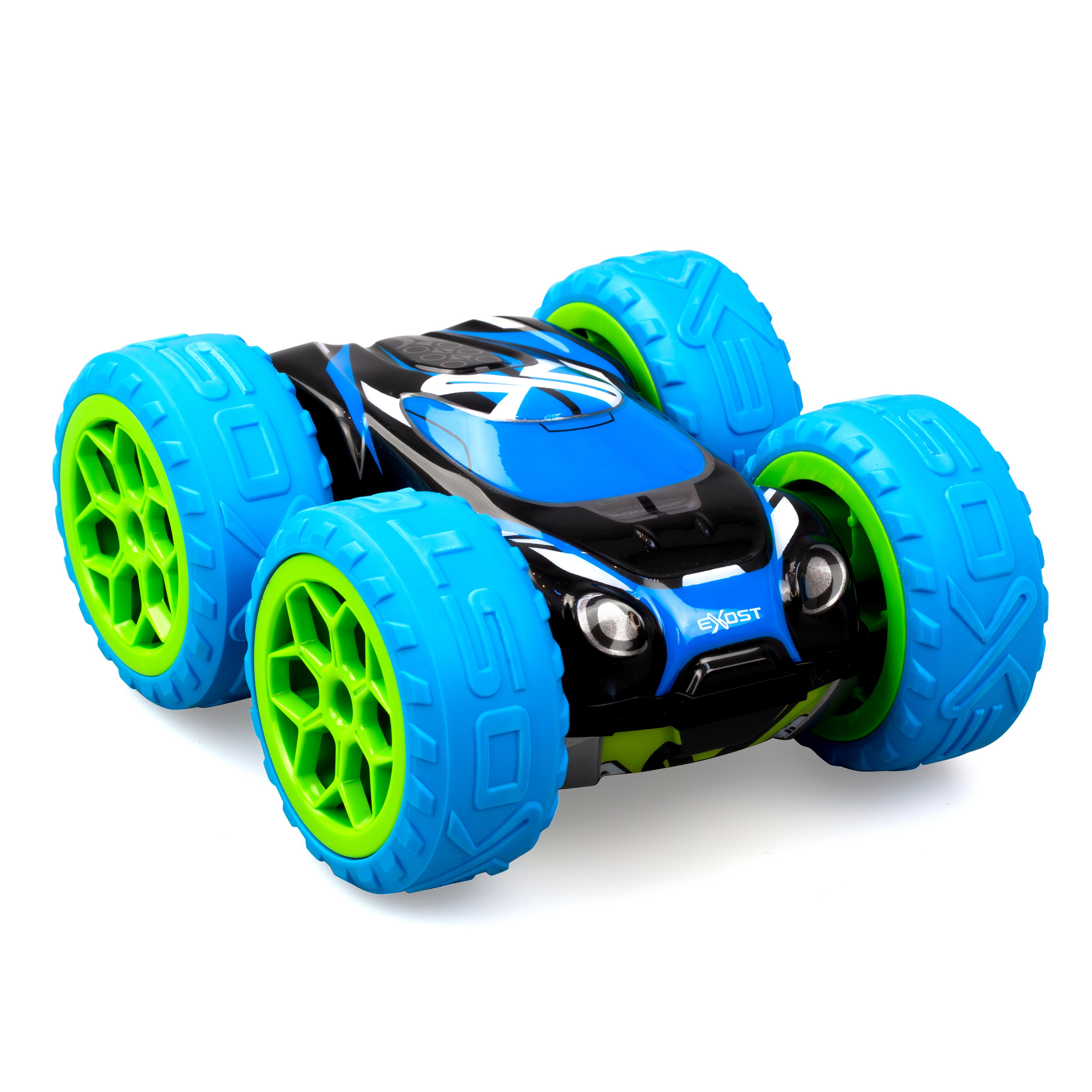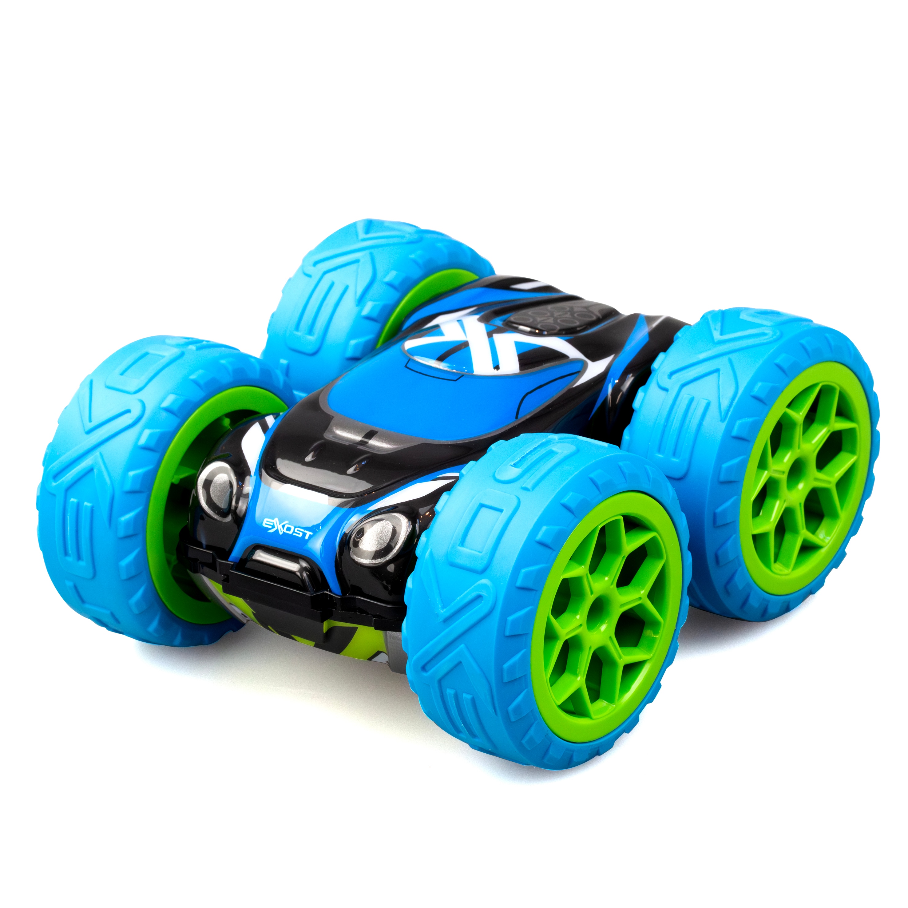 Bilen drives av et oppladbart batteri som enkelt lades via USB-C, slik at den raskt er klar for neste stunt. Med 2,4 GHz-styring kan flere radiostyrte biler kjøres samtidig uten forstyrrelser. De slitesterke EXOST-dekkene gir godt grep både på gulv og tøffere underlag, og den tosidige designen gjør at bilen ser like kul ut uansett hvordan den lander.
