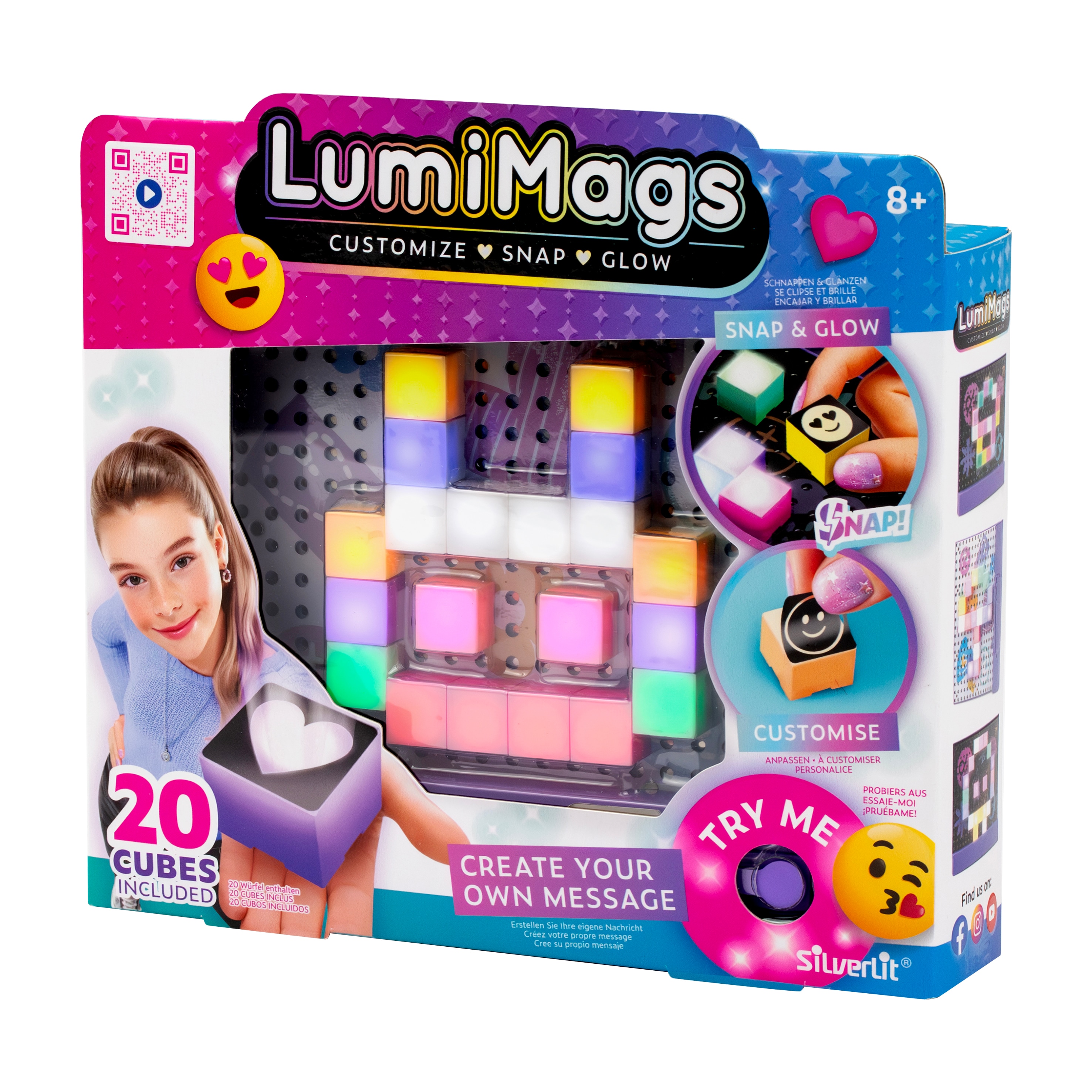 Lag lysende meldinger med LumiMags! Dette magnetiske brettet lar barn uttrykke seg med lys, farger og former. Klikk enkelt på de 20 fargerike LED-klossene og bygg personlige meldinger, mønstre eller morsomme emojis om og om igjen.