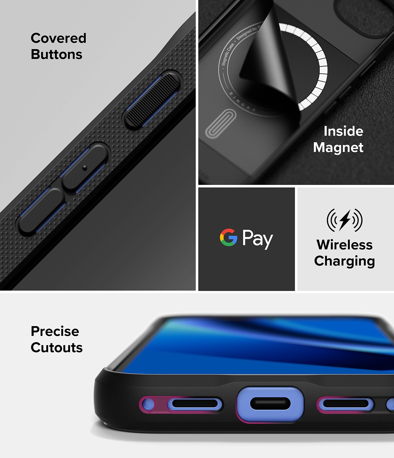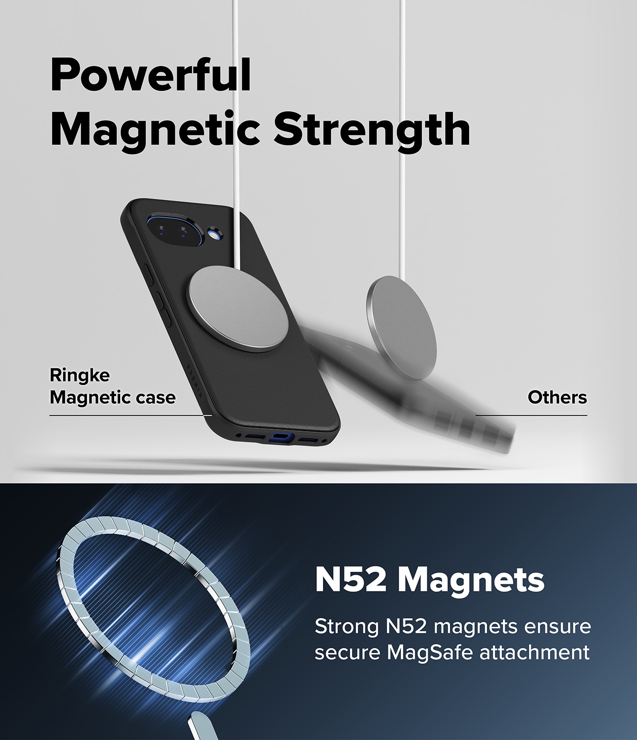 Dette er Onyx Magnetic Case, det tøffe og stilige MagSafe-dekselet til Google Pixel 10a fra Ringke. Dette er ikke bare et deksel – det er en ridder i skinnende rustning med sitt elegante utseende og knallbra støtbeskyttelse. Tenk deg forsterkede hjørner som et ekstra skjold, hevede kanter som en vollgrav, og knapper så taktile at de føles som et hemmelig håndtrykk. Takket være den innebygde magnetiske ringen er dekselet fullt MagSafe-kompatibelt, perfekt for lading eller kortholdere.
