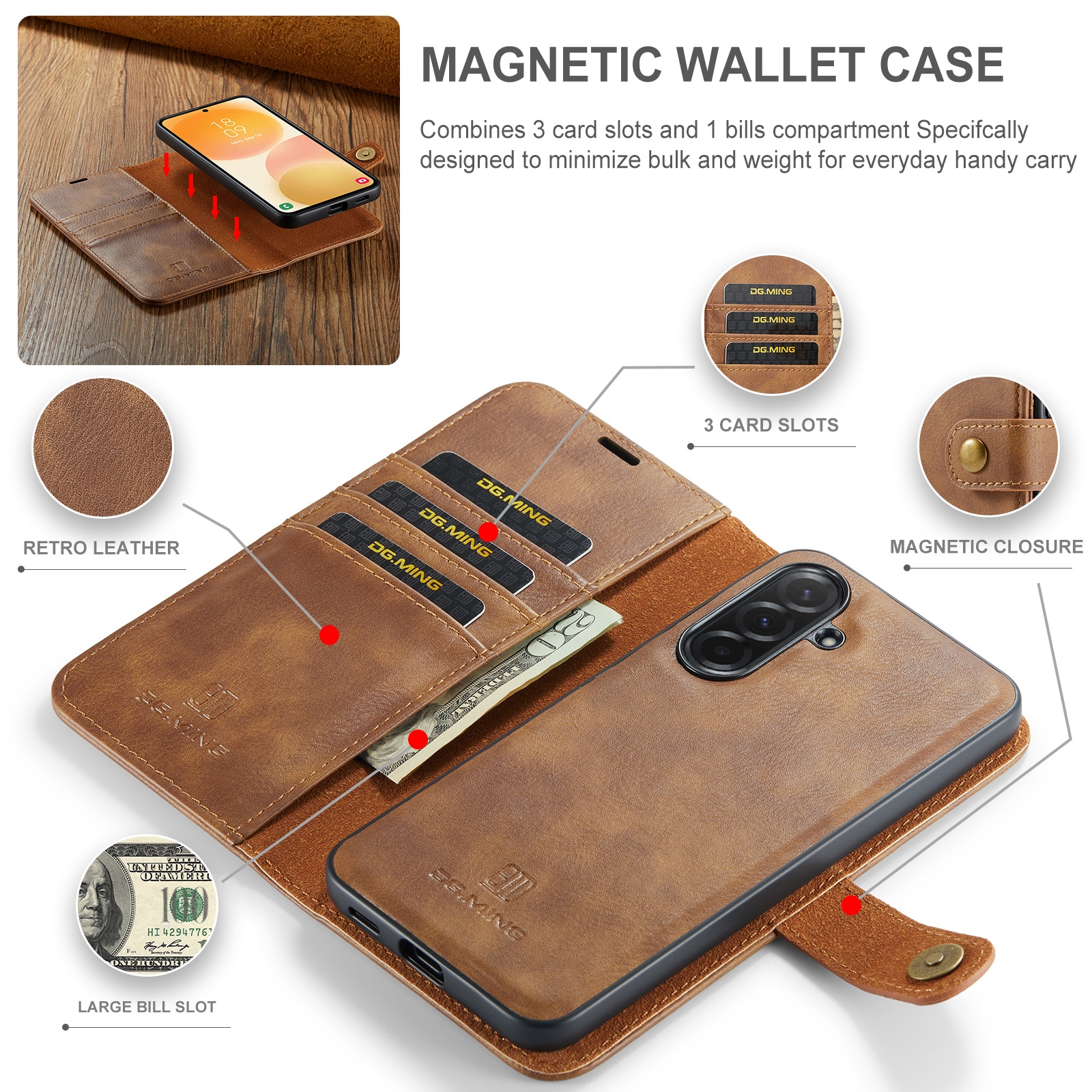 Sjekk ut vårt smarte etui med avtakbart magnetdeksel til Samsung Galaxy A57 fra DG.MING. Dette etuiet kombinerer klassisk stil med praktisk funksjonalitet. Med det avtakbare dekselet kan du enkelt ta ut mobilen fra etuiet når du er hjemme eller på jobb, uten å måtte ha med hele etuiet.