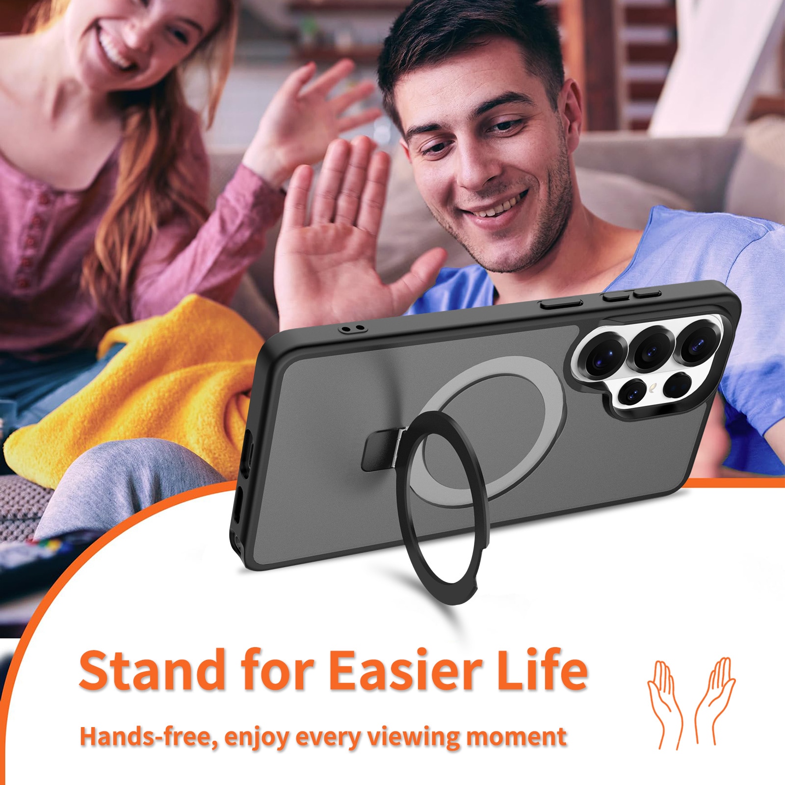 - Magnetringen felles ut for å fungere som et praktisk mobilstativ