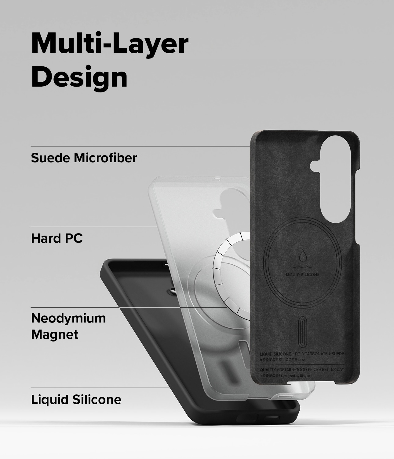 Her har vi en tredelt beskyttelsespakke: Ytterskallet i solid, grepvennlig silikon tar støyten, mens innsiden har en kjerne av hardplast for å takle støt, og et mykt mikrofiberfor på innsiden som er snillt mot mobilens bakside.