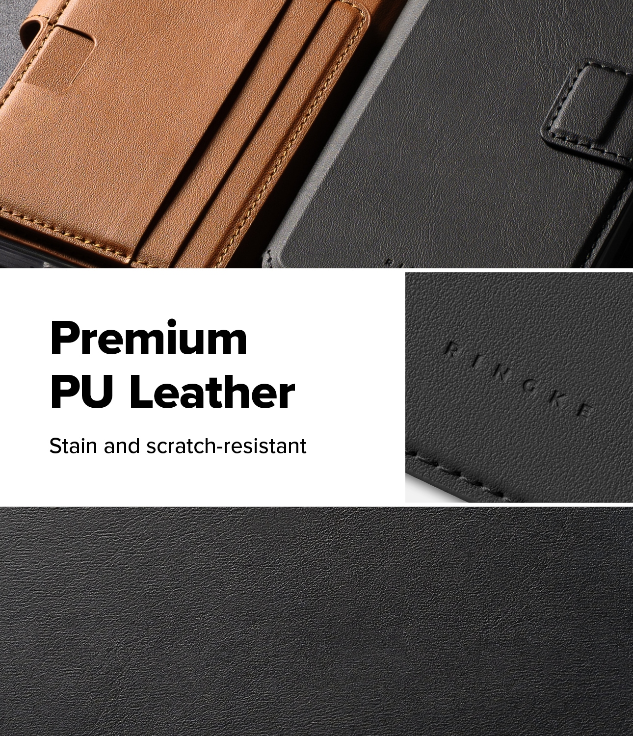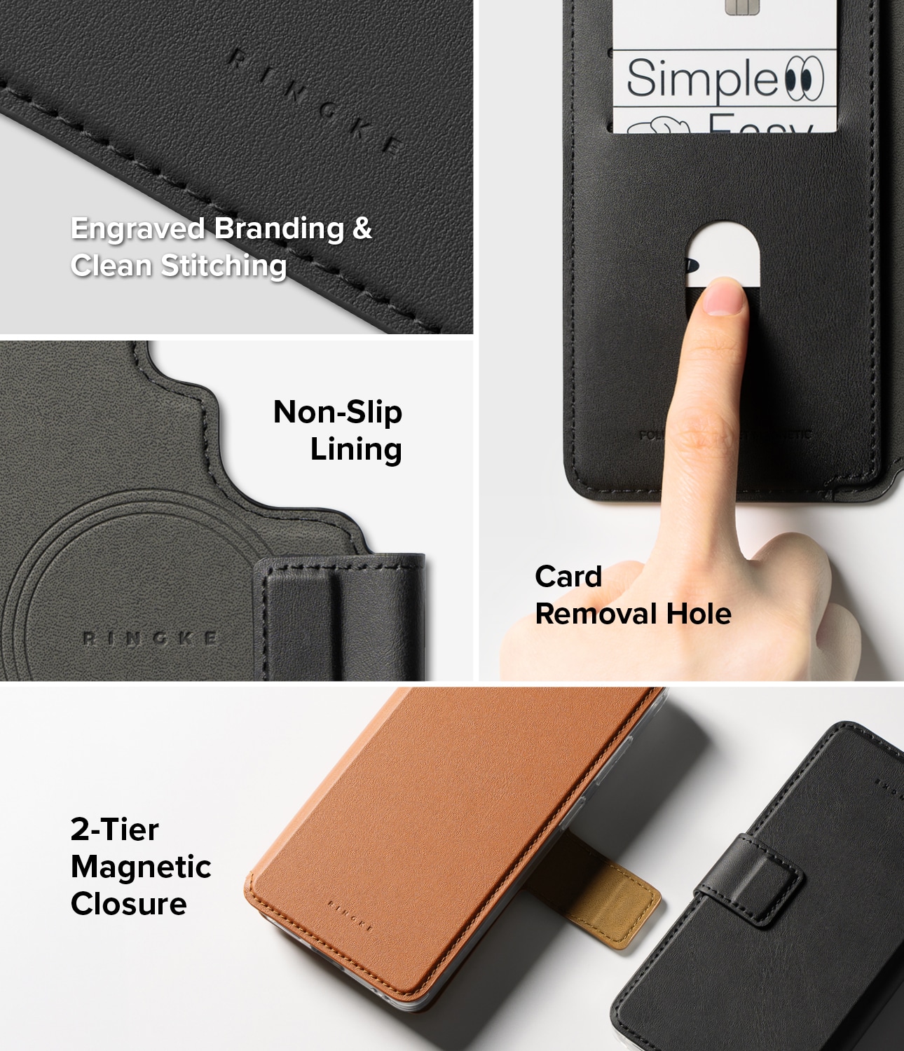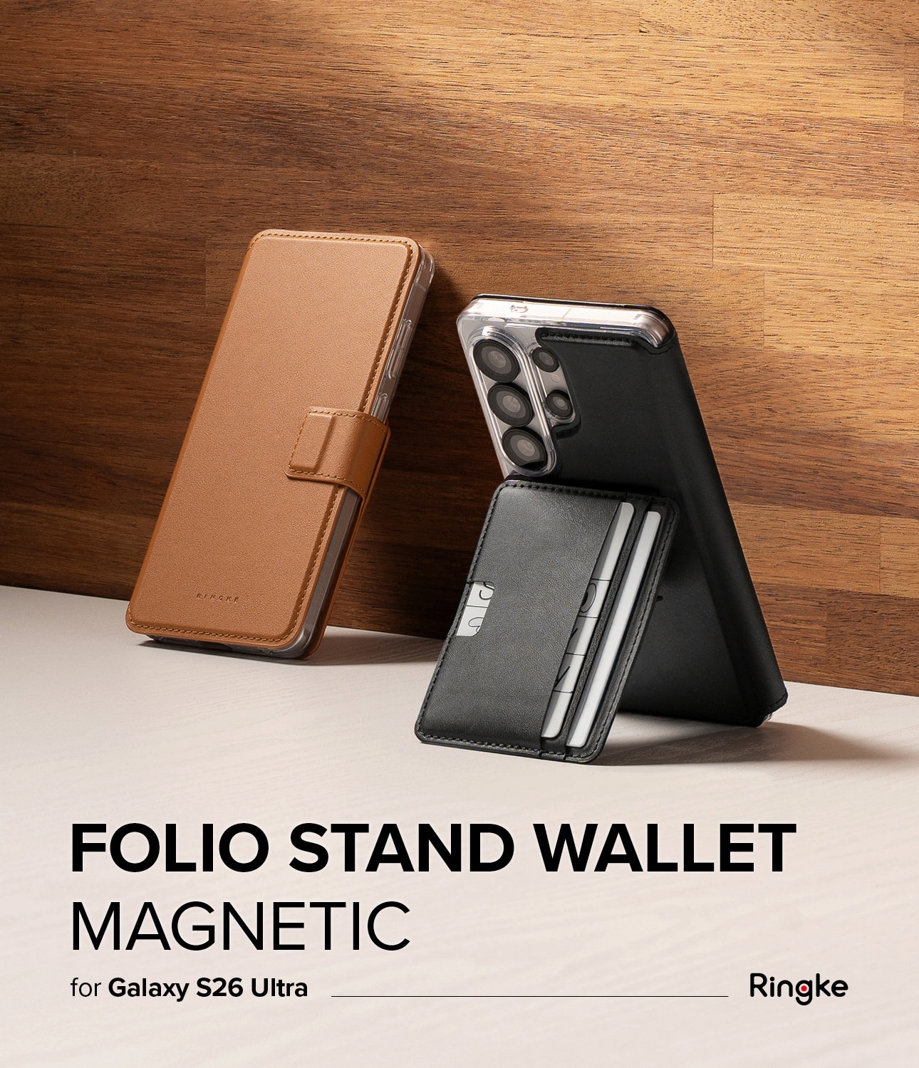Smart, stilren og alltid klar - magnetisk folio-lommebok med innebygd stativ fra Ringke for Samsung Galaxy S26 Ultra. Den festes enkelt med sterk magnet direkte på mobilen eller på et MagSafe-kompatibelt deksel. På innsiden finner du tre kortlommer og en skjult lomme med plass til kontanter, kvitteringer eller andre småting du trenger i hverdagen.