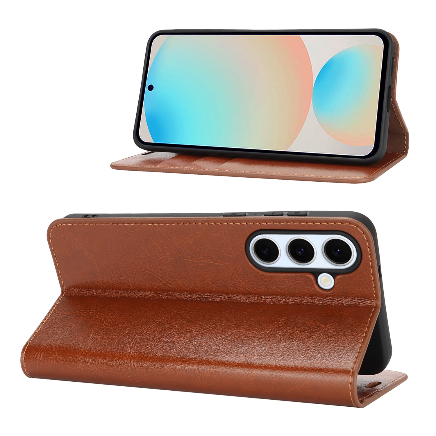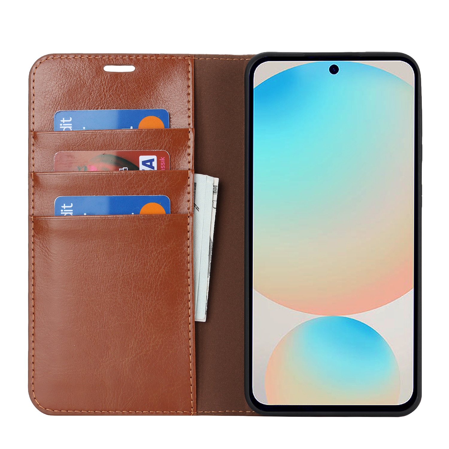 Gjør din Samsung Galaxy S25 FE enda stiligere med et praktisk mobiletui i ekte skinn! Det er slankt, men utrolig smart, med plass til tre kort og en seddel eller to, så du kan la lommeboken ligge hjemme. Mobilen klikker du enkelt på plass i det fleksible, innebygde dekselet som holder den trygt på plass.