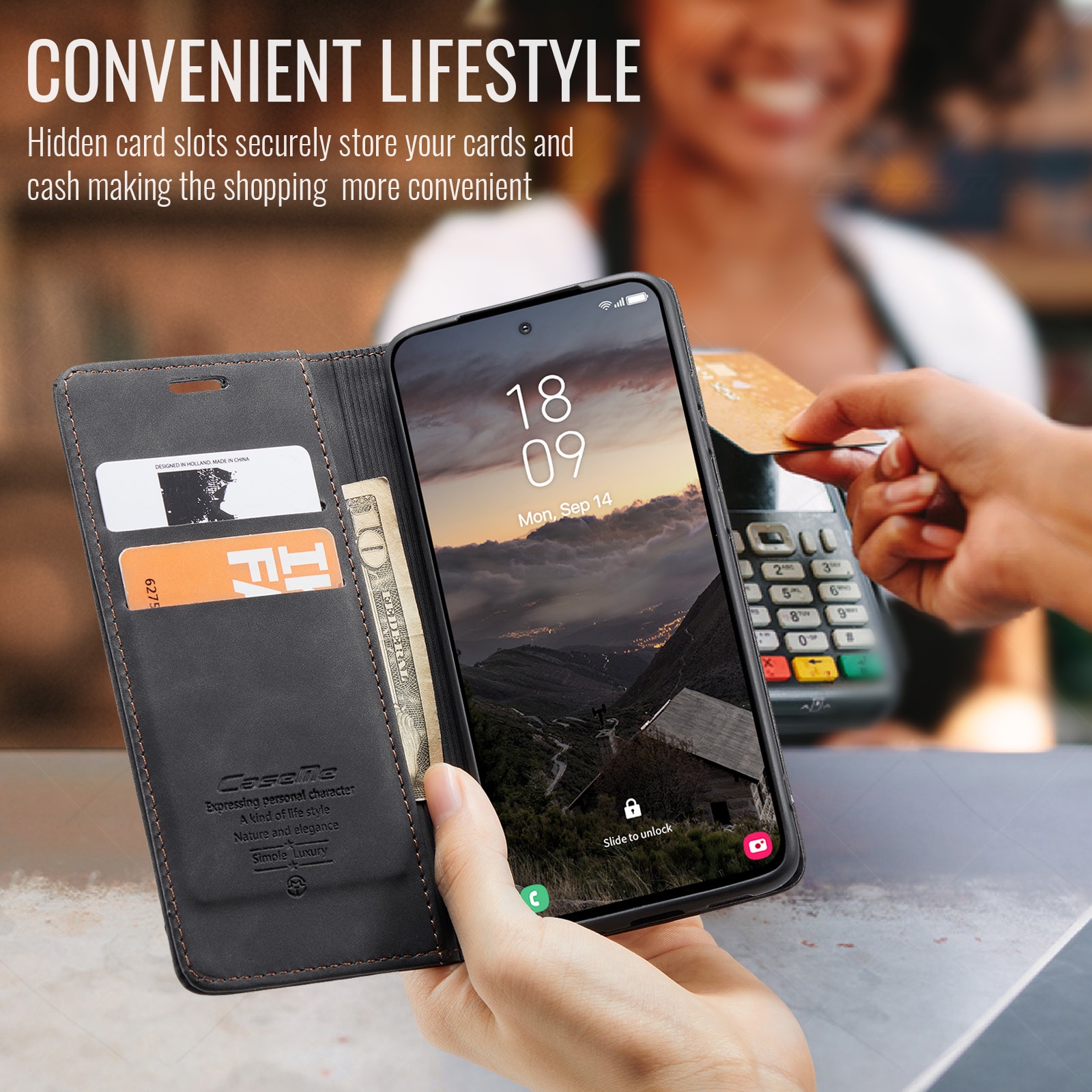 Inni dette etuiet finner du plass til alle kortene dine og en praktisk lomme for sedler eller kvitteringer – her har du virkelig full kontroll! Og hvis du plutselig får lyst til å binge den nyeste serien eller en film? Bare brett etuiet til et praktisk stativ, og du er klar for maraton.