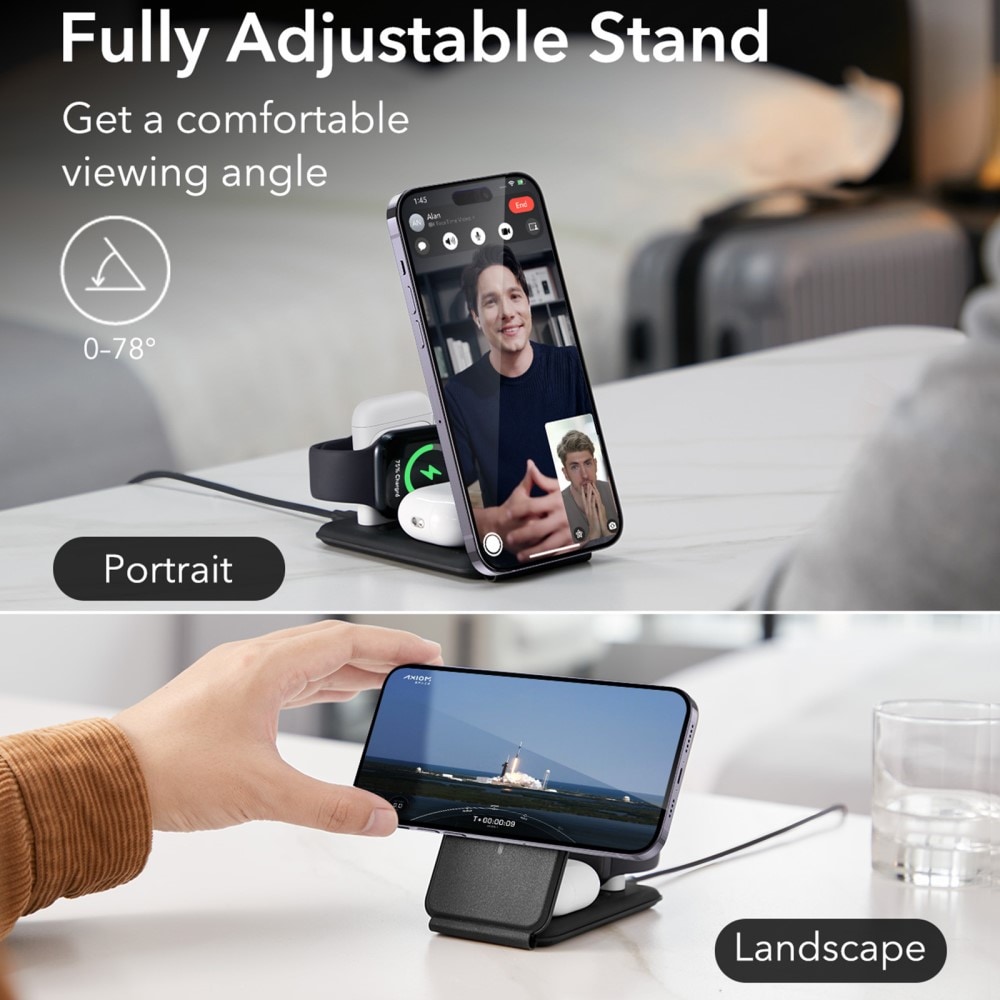 Takket være MagSafe og superstærke magneter holder enhetene dine seg stødig på plass mens de lader, så ingenting glir av! I tillegg kan du justere laderen i portrett- eller landskapsmodus og finne akkurat den vinkelen du trenger. Den avtagbare Apple Watch-laderen er perfekt å pakke med seg på reise – superfleksibel! Og for å toppe det hele, følger det med en praktisk liten veske som gjør det lett å ta med deg hele settet overalt - nå kan du lade med stil!