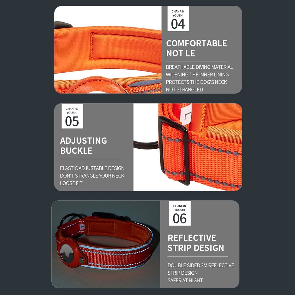 Gi din firbente venn et stilig og praktisk halsbånd i slitesterk nylon, perfekt for å feste din Apple AirTag! Halsbåndet, som er designet for større hunder, har refleksdetaljer som gjør at din pelskling er godt synlig i mørket.