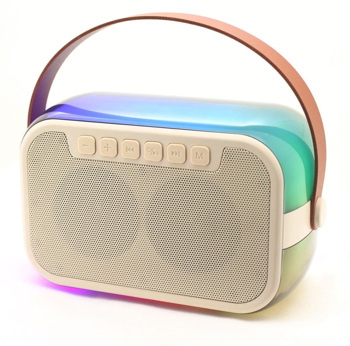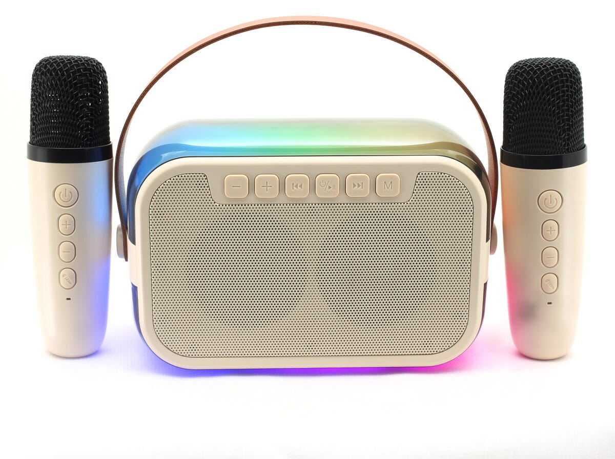 Med denne karaokehøyttaleren og to trådløse mikrofoner er det bare å skru opp volumet og la showet starte. Perfekt til barnebursdager, familiekvelder og spontane sangstunder der alle kan bli med og synge solo, duett eller sammen i gruppe. Den integrerte LED-belysningen med flere lyseffekter skaper ekstra feststemning når favorittlåtene spilles. Spill musikk trådløst via Bluetooth 5.3 med rekkevidde opptil cirka 10 meter, eller bruk Micro SD-kort, USB-minne eller 3,5 mm AUX-tilkobling. Høyttaleren og mikrofonene har innebygde oppladbare batterier som gir opptil cirka 12 timers spilletid uten lyseffekter. Lading skjer enkelt via USB-C og USB-A til USB-C ladekabel følger med. Utformet for enkel bruk til sang, lek og underholdning innendørs.