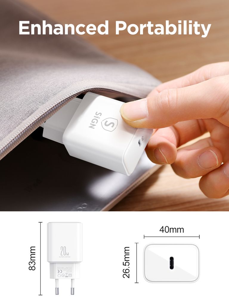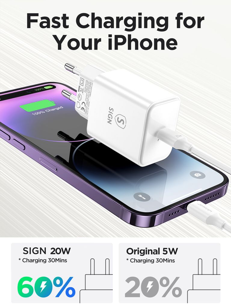 Få strøm raskere med SiGN USB-C PD hurtiglader 20W. Denne kraftige veggladeren gir din iPhone, iPad eller Android-enhet rask lading med Power Delivery-teknologi. Kompatible enheter kan lades opptil 50 prosent på omtrent 30 minutter, perfekt når du trenger rask strøm. Den kobles enkelt til via USB-C og fungerer med USB-C til Lightning eller USB-C til USB-C kabel. Den kompakte designen gjør den enkel å ta med overalt. CE-merking sikrer trygg og stabil lading. Et perfekt valg for rask og enkel lading hver dag.